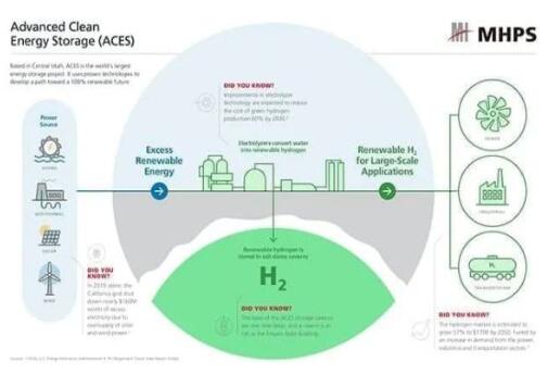 MHPS還通過(guò)猶他州高級(jí)清潔能源存儲(chǔ)(ACES)項(xiàng)目,開(kāi)發(fā)了網(wǎng)格化大規(guī)模的可再生氫生產(chǎn)和存儲(chǔ)技術(shù)。ACES項(xiàng)目使用可再生能源通過(guò)電解生產(chǎn)氫氣。氫氣將在現(xiàn)場(chǎng)的地下鹽穴實(shí)現(xiàn)跨季節(jié)存儲(chǔ),并供給墨西哥灣沿岸的煉油廠。當(dāng)風(fēng)、光可再生能源發(fā)電受限時(shí),存儲(chǔ)的可再生氫可以直接發(fā)電。
