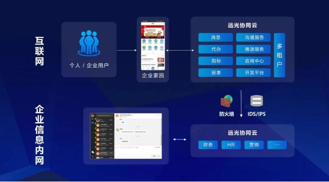 遠(yuǎn)光“企業(yè)家園”采用公有云與私有云共存的混合云架構(gòu),即對(duì)于企業(yè)商密等級(jí)較低的數(shù)據(jù),如消息提醒、待辦提醒等可以通過(guò)移動(dòng)端在外網(wǎng)進(jìn)行實(shí)時(shí)訪(fǎng)問(wèn),對(duì)于企業(yè)內(nèi)部數(shù)據(jù)、商密等級(jí)高的數(shù)據(jù),依然保留在本地,通過(guò)企業(yè)電腦端才能訪(fǎng)問(wèn)。充分利用互聯(lián)網(wǎng)應(yīng)用的靈活性、便利性的同時(shí),保證數(shù)據(jù)的安全性、私密性。