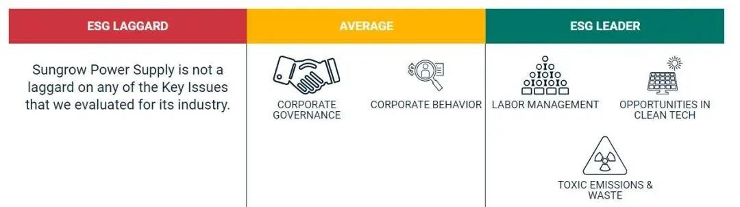 核心ESG議題方面,陽光電源在勞工管理、清潔能源機(jī)遇,以及有害排放和廢棄物三個(gè)指標(biāo)方面都處于行業(yè)領(lǐng)先位置,沒有議題落后于同業(yè)企業(yè)。