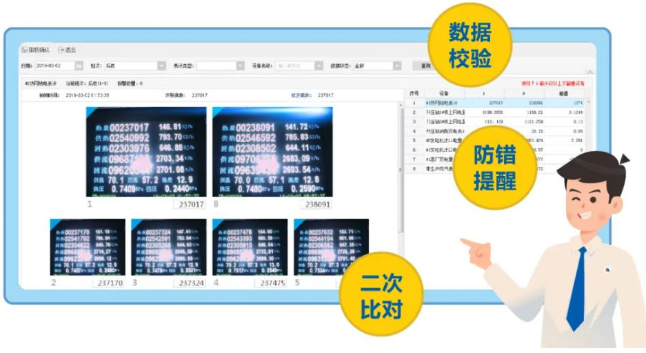 有些工作人員會擔(dān)心,萬一識別的時(shí)候數(shù)據(jù)錯(cuò)誤了,可是我們又很難及時(shí)發(fā)現(xiàn),這可怎么解決?放心,系統(tǒng)對自動讀取的數(shù)據(jù)會首先進(jìn)行歷史數(shù)據(jù)對比校驗(yàn),對不符合預(yù)先設(shè)置范圍及條件內(nèi)的數(shù)據(jù),進(jìn)行防錯(cuò)提醒,并由人工進(jìn)行二次對比審核,保證數(shù)據(jù)準(zhǔn)確。