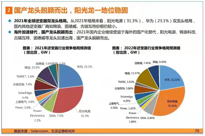 經(jīng)過多年大浪淘沙式的行業(yè)洗牌后,馬太效應(yīng)凸顯,2021年全球逆變器呈現(xiàn)雙龍頭格局。從2021年格局來看,陽光電源占據(jù)31.3%的市場,而華為占據(jù)23.1%。