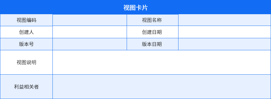 視圖卡片·清晰描述關(guān)系視圖卡片是關(guān)于視圖元信息的描述,通過視圖卡片可以了解視圖編碼、名稱、版本號、創(chuàng)建人、視圖描述和視圖的利益相關(guān)者。