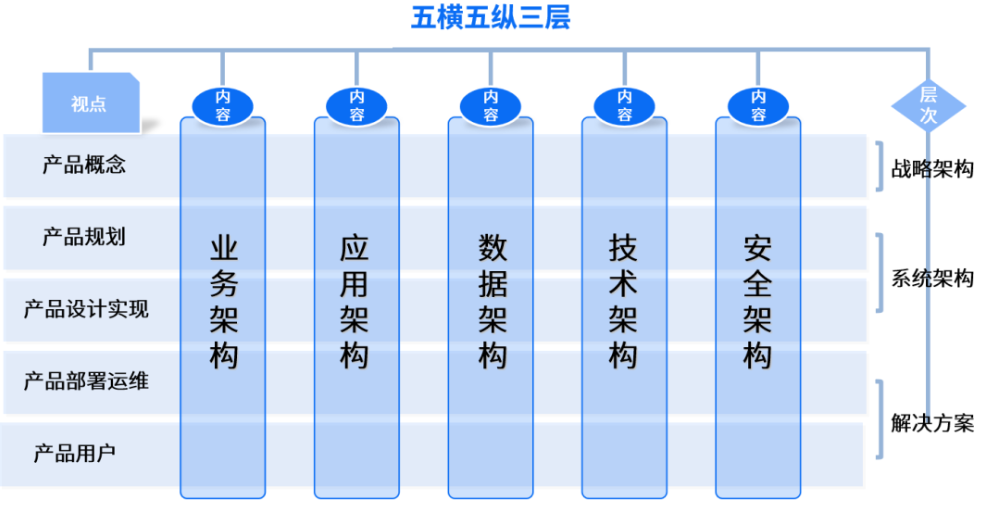 五縱,即縱向包括的五大架構(gòu)設(shè)計——業(yè)務架構(gòu)、應用架構(gòu)、數(shù)據(jù)架構(gòu)、技術(shù)架構(gòu)、安全架構(gòu)。