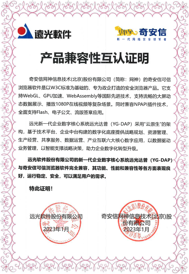 近日,新一代企業(yè)數(shù)字核心系統(tǒng)遠(yuǎn)光達(dá)普(YG-DAP)與奇安信可信瀏覽器完成產(chǎn)品兼容性互認(rèn)證。經(jīng)雙方聯(lián)合測試,二者完全兼容,功能、性能和兼容性方面表現(xiàn)良好,運行穩(wěn)定高效,滿足用戶需求。