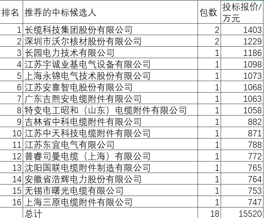 根據(jù)此前(2024年3月7日)推薦的中標候選人公示,共招18包15520萬元,16家供應(yīng)商中標。長纜科技、沃爾核材中標2包,其余供應(yīng)商中標1包。中標金額分布較為均衡,10家過800萬元,8家過1000萬元,長纜科技最高,1403萬元,三原電纜附件最低,747萬元。