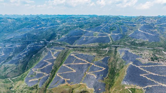 俯瞰黔中大地,不計(jì)其數(shù)的光伏板沿著山勢(shì)鋪滿了千溝萬(wàn)壑,在陽(yáng)光下匯成“藍(lán)色海洋”;一座座大型風(fēng)力發(fā)電機(jī)矗立山巔,巨大的葉片隨風(fēng)而舞,向電網(wǎng)源源不斷輸送綠電。
