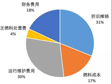 核電發(fā)電成本由折舊攤銷、燃料成本、運(yùn)行維護(hù)費(fèi)用、財(cái)務(wù)費(fèi)用、乏燃料處置費(fèi)用等組成(見(jiàn)圖2)。在電改背景下,核電上網(wǎng)面臨“量?jī)r(jià)齊跌”壓力,經(jīng)濟(jì)性提升壓力日益增大,并進(jìn)一步向上游傳導(dǎo)至核燃料加工產(chǎn)業(yè)。
