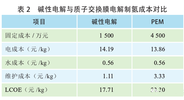 以堿性電解和PEM電解項(xiàng)目(1000Nm3/h)為例,假設(shè)項(xiàng)目全生命周期為20年,運(yùn)行壽命9萬h,固定成本包裹電解槽、氫氣純化裝置、材料費(fèi)、土建費(fèi)、安裝服務(wù)費(fèi)等項(xiàng)目,電解以0.3元/kWh計(jì)算,成本對比見表2。
