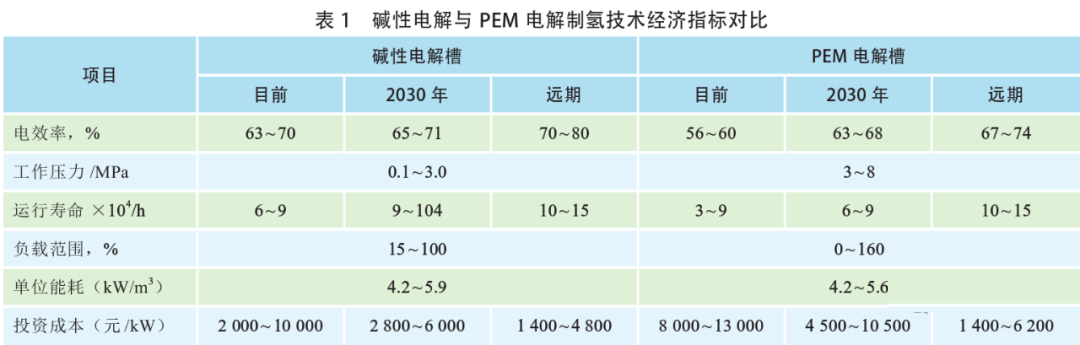 我國以可再生能源(如風(fēng)電、光伏、水電)進(jìn)行電解水制氫,電價(jià)控制在0.25元/kWh以下時(shí),制氫成本具有相對經(jīng)濟(jì)性(15.3~20.9元/kg)。堿性電解與PEM電解制氫技術(shù)經(jīng)濟(jì)指標(biāo)見表1。