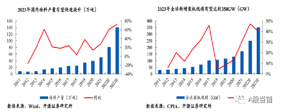隨著硅料價格回落,全球景氣市場(國內(nèi)分布式、歐洲市場)有望保持快速增長,部分被抑制需求(國內(nèi)集中式、亞太市場、中東非市場)也有望釋放,疊加美國政策邊際放松有望帶來裝機(jī)規(guī)??焖偬嵘?預(yù)計2023年全球新增裝機(jī)規(guī)模將達(dá)到350GW。