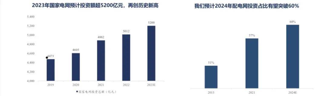 2019-2022年國(guó)家電網(wǎng)實(shí)現(xiàn)投資總額4473億元、4605億元、4882億元、5012億元,1月11日國(guó)家電網(wǎng)董事長(zhǎng)辛保安在接受采訪時(shí)表示2023年將繼續(xù)加大電網(wǎng)投資,預(yù)計(jì)投資超5200億元,再創(chuàng)歷史新高,而電網(wǎng)投資結(jié)構(gòu)性特征突出,根據(jù)中電聯(lián)數(shù)據(jù),我國(guó)配電網(wǎng)的投資占比從2015年的51%提升至2021年57%。