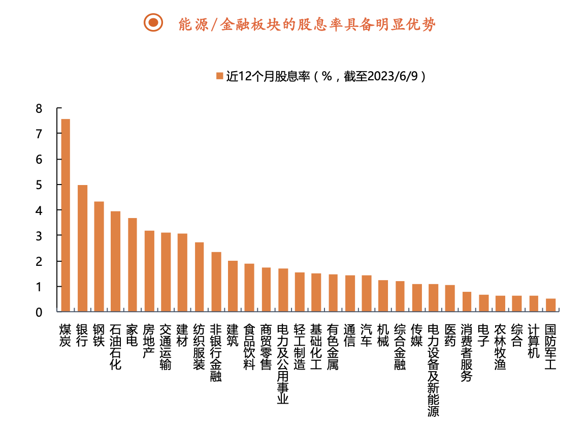 與此同時(shí),平安證券研報(bào)指出,在“中特估+分紅”細(xì)分主線下能源領(lǐng)域有望顯著受益。根據(jù)近12個(gè)月股息率(截至2023/6/9),能源股息率具備明顯優(yōu)勢(shì),煤炭、鋼鐵、石油化工股息率均位列前五。