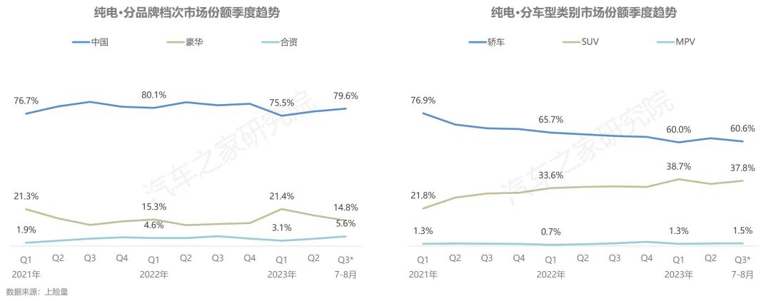 而從車型的角度上看,新能源純電市場產(chǎn)品結(jié)構(gòu)暫時趨于穩(wěn)定,轎車占據(jù)六成的市場份額,是絕對的主力車型,SUV車型占據(jù)近40%的市場空間,但發(fā)展態(tài)勢正在處于上升通道之中,MPV車型市場空間持續(xù)穩(wěn)定在相對微小的水平。