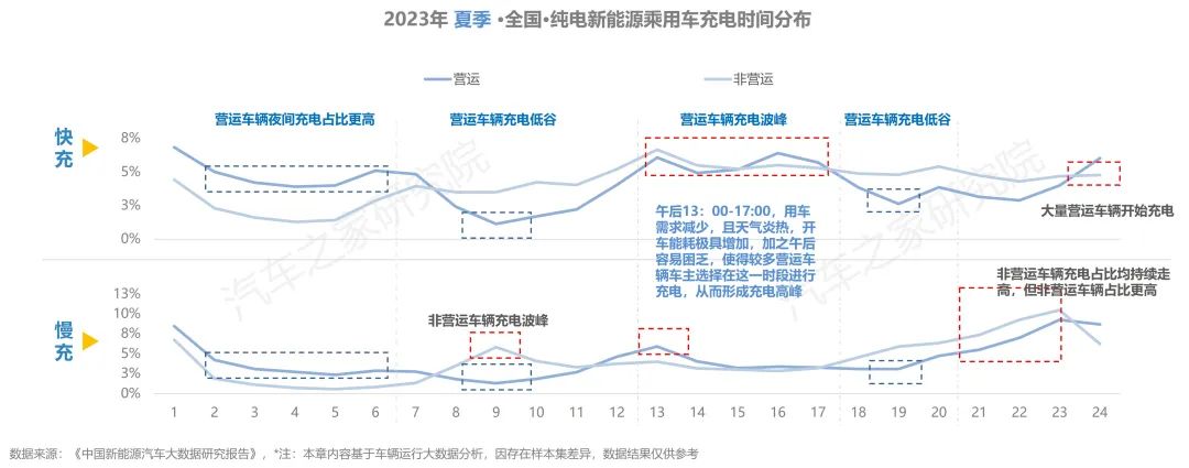 從充電開始時間上看,營運車輛在充電時,快充與慢充的波峰、波谷時間基本一致。早9時與晚19時是營運車輛充電的低谷,同時夜間充電比例更高。此外,由于午后用車需求減少,且夏季天氣炎熱,開車能耗大幅增加,加之午后容易困乏,使得較多車主選擇在下午13-17時進行快充補能,從而形成充電高峰。當(dāng)選擇慢充進行補能時,非營運車輛第一次充電高峰出現(xiàn)在上午9時而后快速回落,第二次是從19時開始一路攀升,至23時到達頂點,開始充電時間與營運車輛相比明顯更早。