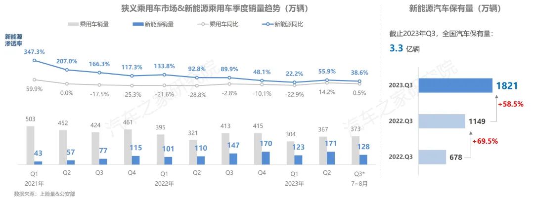 今年以來,國家層面針對汽車行業(yè)轉(zhuǎn)型升級的政策頻出,使得中國車企在新能源的浪潮中迎來重大的發(fā)展機遇。此外,商務(wù)部推動“百城聯(lián)動”汽車節(jié)和“千縣萬鎮(zhèn)”新能源汽車消費季效果顯現(xiàn),這都無疑在讓中國的汽車產(chǎn)業(yè)從生產(chǎn)端與消費端兩個方向,呈現(xiàn)出新能源汽車市場爆發(fā)式增長。目前,中國新能源汽車保有量已經(jīng)突破1800萬輛,今年1-8月新能源乘用車更是取得超420萬輛銷量的成績,同比增長逾三成,市場滲透率持續(xù)保持超30%的高水平發(fā)展。