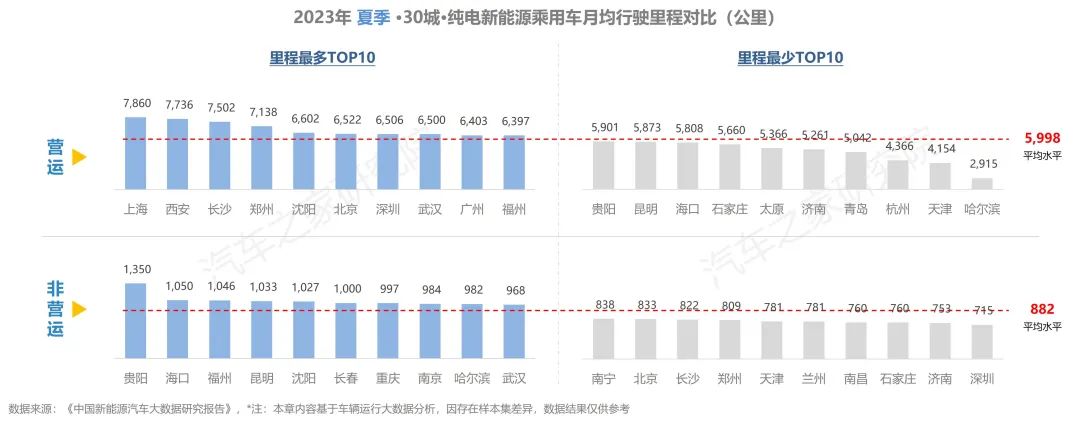 30個城市中,上海、西安等4個城市營運車輛月均行駛里程超過7000公里,與春季僅有兩個城市超7000公里相比,數(shù)量有所增加。非營運車輛行駛最多的是貴陽,月均里程超1300公里,遠超其他城市,其余城市家用純電車型行駛里程差距較小,深圳私家車主跑的最少。