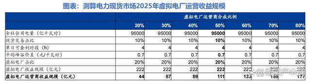 測算得到,通過電力現(xiàn)貨市場獲利模式下,當(dāng)虛擬電廠運營商分成比例為50%時,虛擬電廠2025年運營市場規(guī)模為111億元。