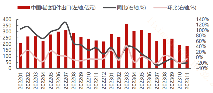 產(chǎn)業(yè)鏈出海維度,11月我國太陽能電池(含組件)出口金額183.06億元,同比-19.73%、環(huán)比-5.14%,自10月以來單月出口額繼續(xù)低于200億元,但同環(huán)比降幅相較10月份均有所收窄。11月逆變器出口40.22億元,同比-45.94%,環(huán)比+0.91%,環(huán)比迎來自6月以來的首次由負轉(zhuǎn)正。