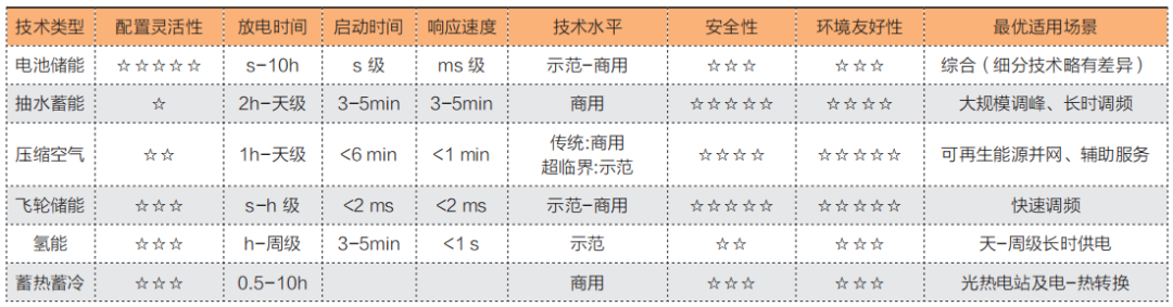 綜合分析各類儲能的技術(shù)特點,從配置靈活性上看,電池儲能配置靈活性及可擴展性最為優(yōu)異,抽水蓄能及傳統(tǒng)洞穴式壓縮空氣配置靈活性最差;從儲能發(fā)電時長上看,氫能發(fā)電時間可達周級,抽水蓄能及傳統(tǒng)洞穴式壓縮空氣次之,電池儲能放電時間基本在s-10h之間;從啟動及響應(yīng)速度上看,飛輪、超級電容和電池儲能技術(shù)基本在ms-s級別,適用于快速響應(yīng)的調(diào)頻領(lǐng)域;從安全性上看,機械儲能安全性最為優(yōu)異,電化學(xué)儲能的安全性相對較弱。