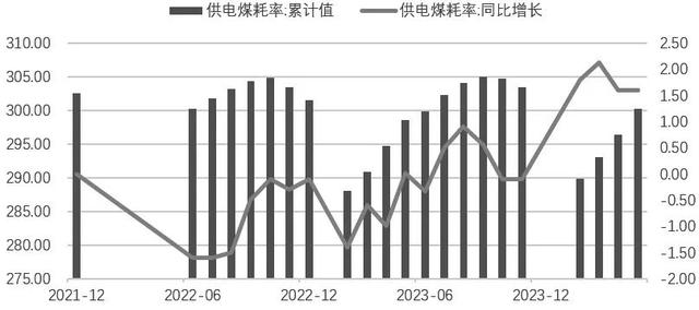 圖為全國(guó)供電耗煤率及同比變化