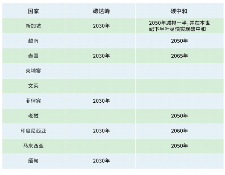 東盟各國(guó)碳達(dá)峰碳中和承諾時(shí)間表  (數(shù)據(jù)來(lái)源:各國(guó)自主貢獻(xiàn)目標(biāo)、中長(zhǎng)期減排發(fā)展戰(zhàn)略)