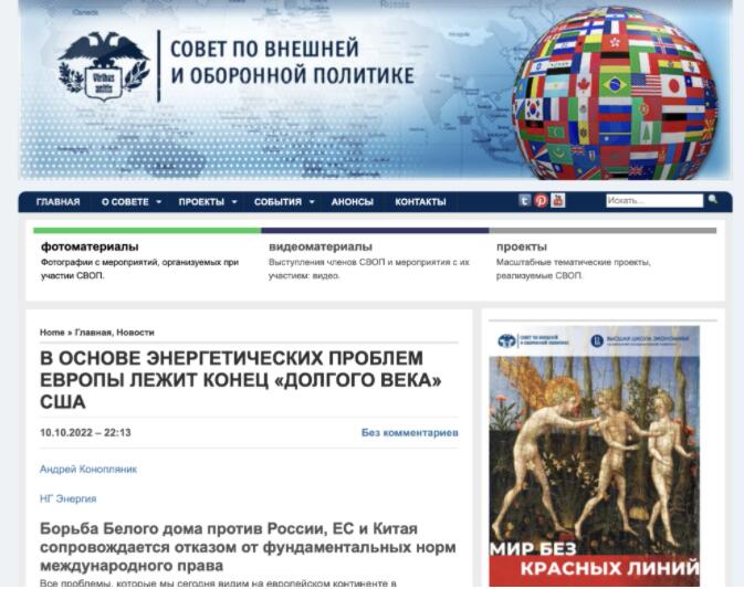 “歐洲的能源問題基于美國‘漫長世紀(jì)’終結(jié)”,截圖來自“俄羅斯外交與國防政策委員會”網(wǎng)站