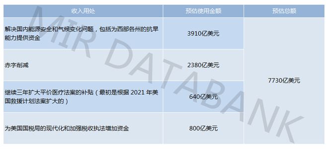 IRA法案的實(shí)施是政治家們的游戲,但透過政治博弈的波譎云詭,人們更關(guān)心的是法案本身到底在傳達(dá)什么信息。簡單來說,IRA法案旨在通過減少赤字、降低處方藥價(jià)格、投資國內(nèi)能源生產(chǎn)以及促進(jìn)清潔能源產(chǎn)業(yè)來遏制通膨。以上的想法是偉大的,但是美國目前國家債務(wù)高筑,聯(lián)邦政府連年擴(kuò)大赤字,美國的國家總債務(wù)限額屢屢被觸及,需要提高債務(wù)上限。這項(xiàng)宏大的新能源投資刺激法案的錢從哪來?又被具體分配到哪些領(lǐng)域? 這些問題由MIR睿工業(yè)通過對法案原文的解讀總結(jié)出下列圖表: