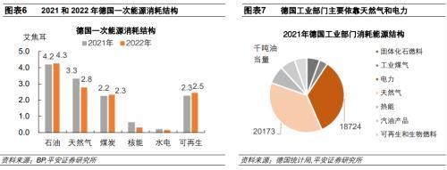 近年來德國一次能源消費震蕩走低,2022年德國天然氣消費量下降15.2%,工業(yè)部門對天然氣的依賴度較高。2017年以來,德國一次能源消耗量逐步減少。2021年疫后需求復(fù)蘇,德國一次能源消耗量增長3.2%,消耗12.8艾焦耳。2022年德國一次能源消費量下降3.8%,降至12.3艾焦耳。天然氣是德國第二大一次能源消費來源,2021年德國消費3.3艾焦耳天然氣,占總消費能源的25.8%。根據(jù)IEA統(tǒng)計,德國天然氣60%依賴俄羅斯供給。受供給沖擊影響,2022年德國天然氣消費量同比下降15.2%,從3.3艾焦耳降至2.8艾焦耳,同時可再生能源、煤炭和石油消費量分別提升了8.7%、4.5%和2.4%,一定程度上彌補了天然氣供應(yīng)不足帶來的能源消費缺口。德國工業(yè)部門對天然氣和電力能源需求的依賴度較高,2021年德國工業(yè)部門能源消費中,天然氣為20173千噸油當量,占比36.9%;電力為18724千噸油當量,占比34.3%。