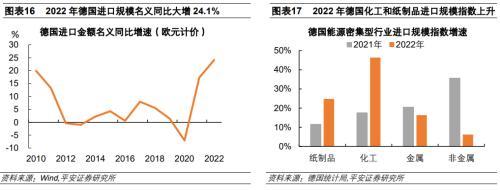 德國通過大量進口能源密集型產(chǎn)品來彌補本國產(chǎn)能缺口,體現(xiàn)為2022年德國化工品和紙制品進口規(guī)模指數(shù)大幅上升。2011年以來,德國進口規(guī)模較為穩(wěn)定。2021年德國進口規(guī)模增長17.3%,2022年德國進口規(guī)模大幅增長24.1%。從能源密集型行業(yè)來看,剔除價格因素后,2022年化工和紙制品進口規(guī)模指數(shù)大幅上升,分別增長46.4%和24.8%,金屬和非金屬2022年進口增速則低于2021年增速。