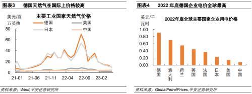 橫向比較來看,德國天然氣價格在主要工業(yè)國家中處于較高水平,德國企業(yè)電力價格在2022年底全球最高。主要工業(yè)大國中,德國和日本在天然氣供給方面較為相似,二者的天然氣價格走勢十分接近,在2022年中天然氣價格大幅攀升,并于近期價格出現(xiàn)了回落。但中美的天然氣價格則較為穩(wěn)定,德國天然氣價格在2022年8月最高峰時分別是美國和中國天然氣價格的8倍和16倍。德國電力價格在2022年底達到了全球最高的0.91美元/千瓦時,遠高于日本、美國和中國0.23、0.15和0.09美元/千瓦時的電價。這引發(fā)市場對于德國制造業(yè)發(fā)展高度的擔(dān)憂。