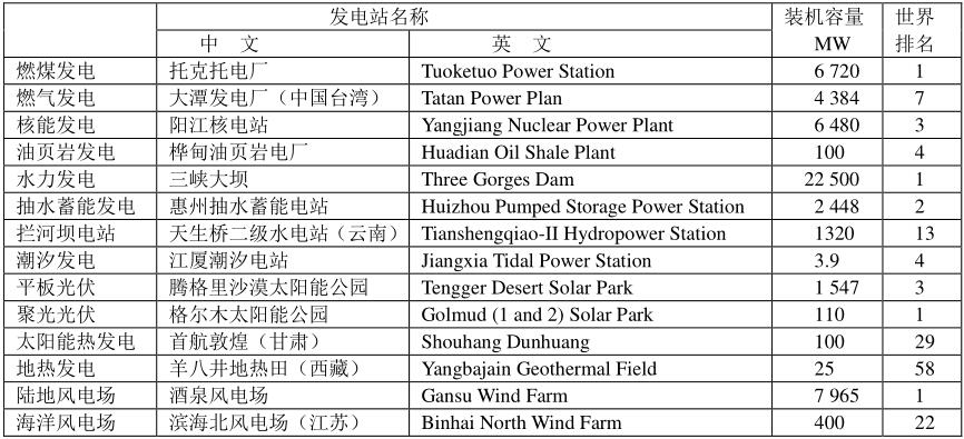 全球前20位發(fā)電站的順序是隨著時(shí)間而變化的,下表是最新的排序。目前全球20席中,中國占有六席:水力發(fā)電占有4席:三峽大壩、溪洛渡大壩、向家壩和龍灘大壩;燃煤發(fā)電占一席:托克托電廠;核能發(fā)電占一席:陽江核電站。