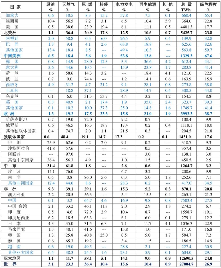 本資料根據(jù)BP 2020年報(bào)告的數(shù)據(jù),再經(jīng)過計(jì)算而成。本文所指的化石燃料是原油、天然氣和原煤構(gòu)成;非再生能源由化石燃料和核燃料構(gòu)成。綠色能源由水力發(fā)電、再生能源和“其他”構(gòu)成。“其他”指抽水蓄能、城市廢物發(fā)電等。綠色程度為水力發(fā)電、再生能源和“其他”的水力發(fā)電、再生能源和“其他”的%之和,用%表示。表中藍(lán)色表示這些國家綠色程度超過了世界平均值26.9%。
