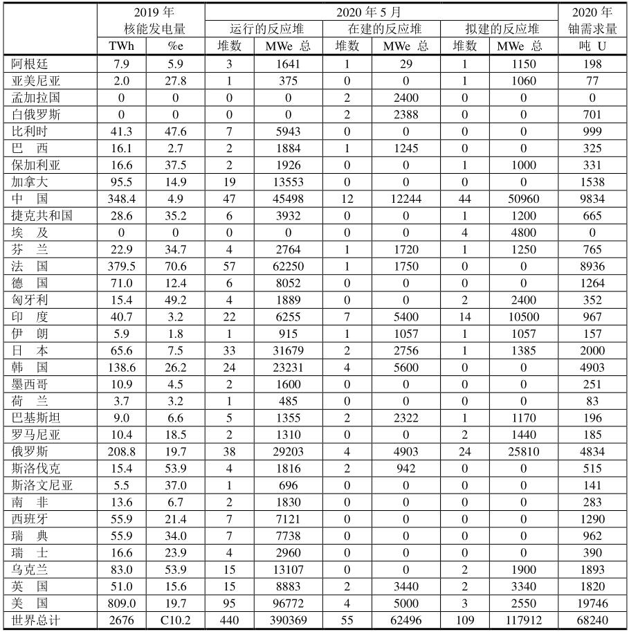 表中“%e”表示核能發(fā)電占發(fā)電總量的百分率。全球核能發(fā)電占全球發(fā)電總量的10.2%,其中法國高達70.6%。本數(shù)據(jù)是世界核能協(xié)會WNA 2020年5月份提供的數(shù)據(jù)。