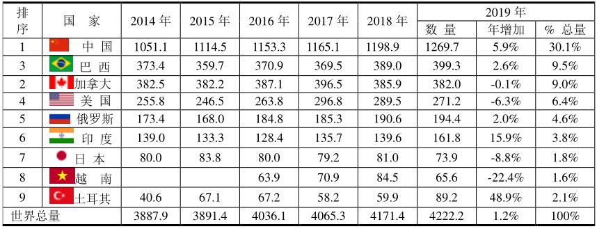 根據(jù)BP 2020的報告,中國水力發(fā)電量居世界之首,2019年占全球水力發(fā)電量的1269.7/4222.2=30.1%;其次為巴西、加拿大。