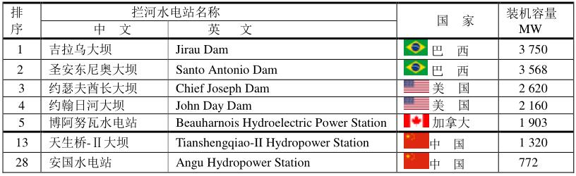全球徑流式水電站第一位是巴西的“吉拉烏大壩”,美國(guó)的“約瑟夫酋長(zhǎng)大壩”已經(jīng)從第一位降低到第三位。中國(guó)最大的徑流式水電站是天生橋-Ⅱ大壩,世界排序13,裝機(jī)容,1320MW。