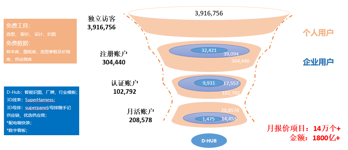 我們既然定下這個(gè)目標(biāo),就要一步一步來實(shí)施,做云端SaaS服務(wù),把原來的賣軟件的業(yè)務(wù)變成云服務(wù)。把我們原來的報(bào)價(jià)軟件、設(shè)計(jì)軟件全部云端化并且共享一個(gè)數(shù)據(jù)庫。我們又做了選型軟件、生產(chǎn)安裝的軟件,目前正在開發(fā)數(shù)字看板和數(shù)字工廠,所有的這些產(chǎn)品通過D-Hub是共享同一套數(shù)據(jù)庫。我們把原來離線的產(chǎn)品都變成在線,其中一部分軟件和數(shù)據(jù)免費(fèi)為用戶服務(wù),這些免費(fèi)的軟件和內(nèi)容吸引了大量的用戶,現(xiàn)在我們的獨(dú)立訪客有390萬。當(dāng)然我們也有收費(fèi)的產(chǎn)品D-Hub。利馳已經(jīng)從一家CAD軟件公司轉(zhuǎn)變?yōu)樵诰€服務(wù)公司,我們其中的一個(gè)在線服務(wù)——電氣工程項(xiàng)目報(bào)價(jià)——最新的數(shù)據(jù)顯示一個(gè)月可以報(bào)14萬個(gè)項(xiàng)目,總價(jià)值約1800億。