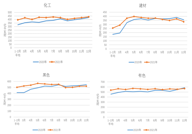 圖3 2020、2021年重點(diǎn)行業(yè)分月用電量情況