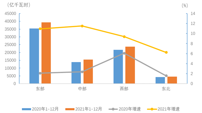 1-12月,東、中、西部和東北地區(qū)③全社會(huì)用電量分別為39366、15459、23795和4508億千瓦時(shí),增速分別為11.0%、11.5%、9.4%和6.2%。