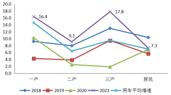 從2021年的兩年平均增速來(lái)看,僅有一產(chǎn)用電增速高于2018、2019年水平,二產(chǎn)、三產(chǎn)及居民生活用電增速在2018和2019年間。