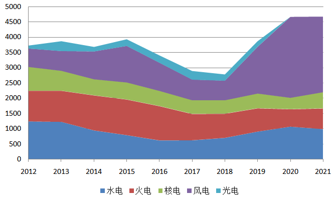 新增發(fā)電裝機(jī)總規(guī)模連續(xù)九年過(guò)億千瓦,2020年為歷年最高水平。2018、2019年受電力供需形勢(shì)變化等因素影響,水電、核電、太陽(yáng)能發(fā)電新增裝機(jī)幾乎減半,導(dǎo)致兩年新增裝機(jī)規(guī)模連續(xù)下滑。2020年,在水電、風(fēng)電、太陽(yáng)能發(fā)電裝機(jī)高速增長(zhǎng)的帶動(dòng)下,新增裝機(jī)容量大幅提升。2021年受火電、風(fēng)電新增裝機(jī)容量減少18%、34%的影響,整體新增規(guī)模同比降低7.9%。