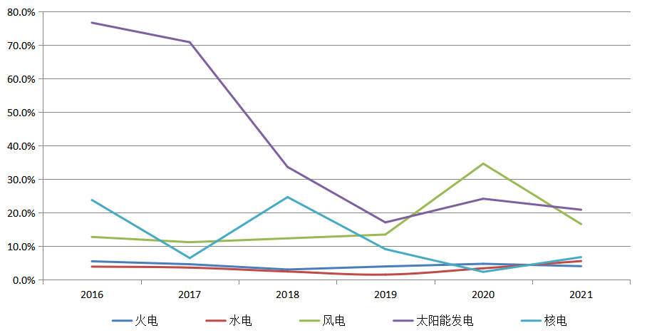 圖6 2016~2021年火電、水電、風(fēng)電、太陽(yáng)能發(fā)電、核電裝機(jī)增速情況
