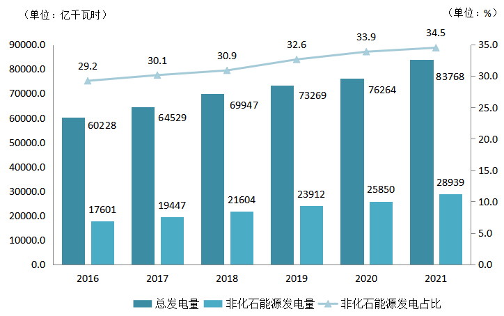 圖13 2016~2021年全國(guó)發(fā)電量及非化石能源發(fā)電占比情況