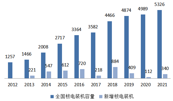 圖11 2012~2021年核電裝機(jī)和新增裝機(jī)情況(單位:萬(wàn)千瓦)