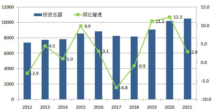 圖17 2012~2021年全國(guó)電力投資總量及增速情況(單位:億元,%)