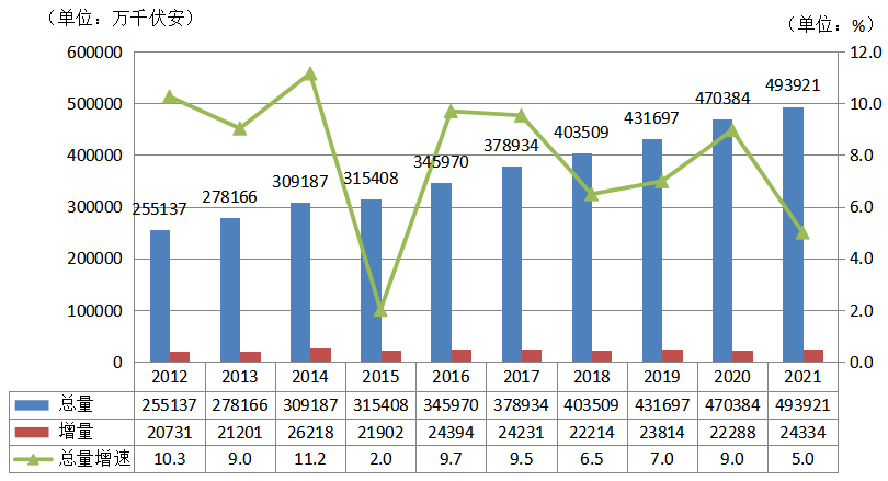 圖4 2012~2021年全國(guó)電力裝機(jī)及增速情況(單位:萬(wàn)千瓦,%)