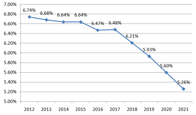 (二)全國(guó)線損率保持下降趨勢(shì),2021年為5.26%