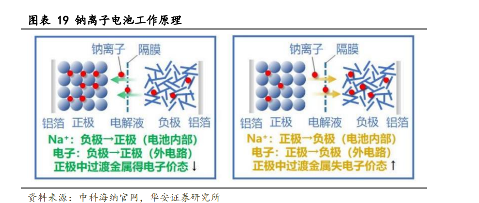鈉電池組成結(jié)構(gòu)、工作原理與鋰電池相似。鈉電池是一種新型二次電池,其組成結(jié) 構(gòu)與鋰電池相似,主要包括正極材料、負(fù)極材料、電解液和隔膜。鈉電池主要通過 Na+ 在電池正負(fù)極之間來回的脫出和嵌入來實(shí)現(xiàn)充放電過程。在充電時(shí),Na+從正極材料脫出, 經(jīng)過電解液和隔膜嵌入到負(fù)極材料,此時(shí),外電路中電子從負(fù)極流向正極。鈉電池放電 過程與充電過程相反。鋰電池則是通過 Li+在電池正負(fù)極之間來回的脫出和嵌入來實(shí)現(xiàn) 上述過程,因此兩者工作原理相似,均被稱為“搖椅式電池”。