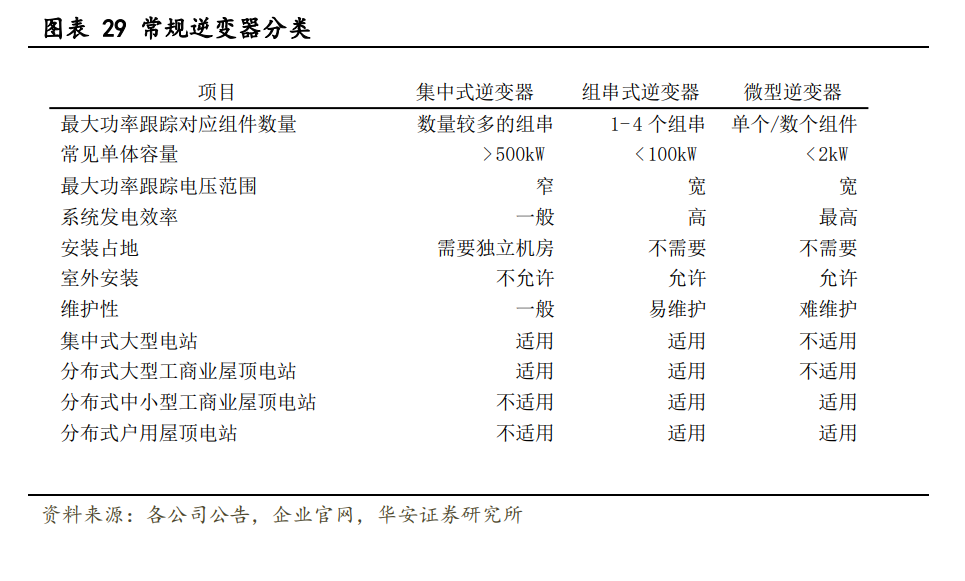 組串 PCS 彌補(bǔ)集中式不足,開啟規(guī)?;瘧?yīng)用。業(yè)內(nèi)目前電池儲(chǔ)能系統(tǒng)主要采取集中 式 PCS,多組電池并聯(lián)將引起電池簇之間的不均衡,久之并聯(lián)電池簇中會(huì)出現(xiàn)一部分電 池實(shí)際出力不足,而另一部分超出倍率使用的現(xiàn)象,造成“木桶”效應(yīng);而組串式 PCS 可 以實(shí)現(xiàn)簇級(jí)管理,提升系統(tǒng)壽命,提高全壽命周期放電容量,規(guī)?;瘧?yīng)用趨勢已見雛形。 當(dāng)前市場以組串式逆變器為主,微型逆變器尚處于發(fā)展階段。綜合考慮逆變器的不同技 術(shù)并結(jié)合其市場策略做出選擇的背景下,當(dāng)前組串式逆變器仍是市場較為主流選擇。目 前,華為、陽光電源、固德威、錦浪科技等光伏逆變器的核心供應(yīng)商均在組串式逆變器 有布局。而微型逆變器作為一種新的技術(shù)路線尚處于發(fā)展期,技術(shù)門檻較高,供應(yīng)商較 少。國外的微型逆變器市場發(fā)展較早,但出貨仍集中于海外龍頭 Enphase。我國微型逆變 器供應(yīng)商較少,一方面是因?yàn)閲鴥?nèi)相關(guān)技術(shù)研發(fā)較晚,另一方面是因?yàn)閲鴥?nèi)市場對于微 型逆變器的需求處于導(dǎo)入階段,尚未進(jìn)入放量階段。