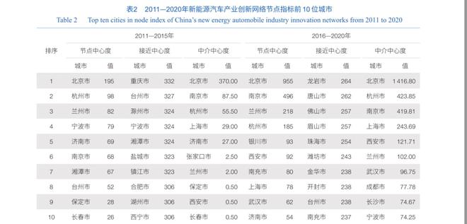 北京市、上海市和其他省會(huì)城市、首府城市是中國(guó)新能源汽車(chē)產(chǎn)業(yè)創(chuàng)新網(wǎng)絡(luò)中的核心節(jié)點(diǎn),并具有引導(dǎo)其他城市共同開(kāi)展新能源汽車(chē)專利合作的能力。由表2可知,北京市節(jié)點(diǎn)中心度自2011年以來(lái)始終是中國(guó)新能源汽車(chē)產(chǎn)業(yè)創(chuàng)新網(wǎng)絡(luò)中各城市的最高值,并且遠(yuǎn)高于其他城市。這反映出北京市不僅在數(shù)量上擁有最多的新能源汽車(chē)產(chǎn)業(yè)專利,同時(shí)相對(duì)于其他城市,還與創(chuàng)新網(wǎng)絡(luò)中更多其他的節(jié)點(diǎn)城市開(kāi)展了新能源汽車(chē)的創(chuàng)新合作。北京市在中介中心度上自2011年以來(lái)也保持著遠(yuǎn)高于其他節(jié)點(diǎn)城市的數(shù)值。這反映了在新能源汽車(chē)產(chǎn)業(yè)創(chuàng)新網(wǎng)絡(luò)中,北京市擁有遠(yuǎn)高于其他城市的在聯(lián)合其他兩個(gè)及兩個(gè)以上城市共同開(kāi)展研發(fā)活動(dòng)的能力。上海市的節(jié)點(diǎn)中心度和中介中心度自2011年以來(lái)上升顯著。同時(shí),杭州市和南京市等其他長(zhǎng)江三角洲城市群地區(qū)的城市也具有較高的節(jié)點(diǎn)中心度和中介中心度。結(jié)合圖1可知,在長(zhǎng)江三角洲城市群地區(qū),上海市同其他城市已經(jīng)形成了復(fù)雜的新能源汽車(chē)產(chǎn)業(yè)創(chuàng)新網(wǎng)絡(luò),同樣具有聯(lián)合其他兩個(gè)及兩個(gè)以上城市共同開(kāi)展研發(fā)活動(dòng)的能力。此外,相較于2011—2015年,2016—2020年的節(jié)點(diǎn)中心度和中介中心度排名前10名的城市中省會(huì)城市和首府城市顯著增多,這是由于省會(huì)城市和首府城市在省內(nèi)和自治區(qū)內(nèi)通常擁有更多的政策傾斜和更為豐富的企業(yè)、科研資源。隨著參與到中國(guó)新能源汽車(chē)產(chǎn)業(yè)創(chuàng)新網(wǎng)絡(luò)中的城市逐漸增多,省會(huì)城市和首府城市更有能力與率先開(kāi)展新能源汽車(chē)研發(fā)的城市開(kāi)展合作,或者自主開(kāi)展并引導(dǎo)其他鄰近城市參與新能源汽車(chē)的研發(fā)活動(dòng)。