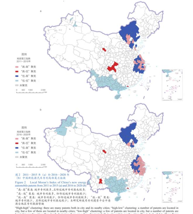 圖2進(jìn)一步說(shuō)明了專利申請(qǐng)的空間集聚現(xiàn)象具體的空間分布特征。① 與北京市鄰近的天津市、保定市和張家口市均為“高-高”聚類地區(qū),但同時(shí)也存在唐山市、廊坊市等“低-高”聚類地區(qū)。這反映出北京市作為新能源汽車(chē)研發(fā)的核心城市,對(duì)其鄰近城市具有一定的知識(shí)溢出效應(yīng),但其溢出具有較為明顯的指向性——雖然部分城市對(duì)于北京市地理鄰近,但北京市知識(shí)溢出并沒(méi)有對(duì)其產(chǎn)生較為明顯的影響。② 在長(zhǎng)江三角洲城市群地區(qū)具有顯著新能源汽車(chē)專利空間集聚現(xiàn)象,以上海市、南京市、杭州市和寧波市等為代表的城市形成了“高-高”聚類的連片區(qū)。同時(shí),比較2011—2015年和2016—2020年的局部莫蘭指數(shù)空間格局可以發(fā)現(xiàn),在2011—2015年,屬于“高-高”聚類的城市外圍存在大量屬于“低-高”聚類的城市,主要分布于浙江省南部、江蘇省北部和安徽省東部;而隨著新能源汽車(chē)產(chǎn)業(yè)的發(fā)展,這些城市逐漸從“低-高”聚類轉(zhuǎn)變?yōu)?ldquo;高-高”聚類,“低-高”聚類區(qū)進(jìn)一步向外圍延伸,這表現(xiàn)出顯著的依托地理鄰近性的知識(shí)溢出效應(yīng)。③ 廣東省西部、廣西壯族自治區(qū)和云南省存在連片的“低-低”聚類區(qū)。這3個(gè)省份均擁有一定的汽車(chē)制造業(yè)基礎(chǔ),但涉及新能源汽車(chē)的企業(yè)相對(duì)較少。盡管廣東省擁有比亞迪等重要新能源汽車(chē)企業(yè),但其知識(shí)溢出也僅局限于粵港澳大灣區(qū),難以產(chǎn)生較為明顯的地理鄰近上的知識(shí)溢出。